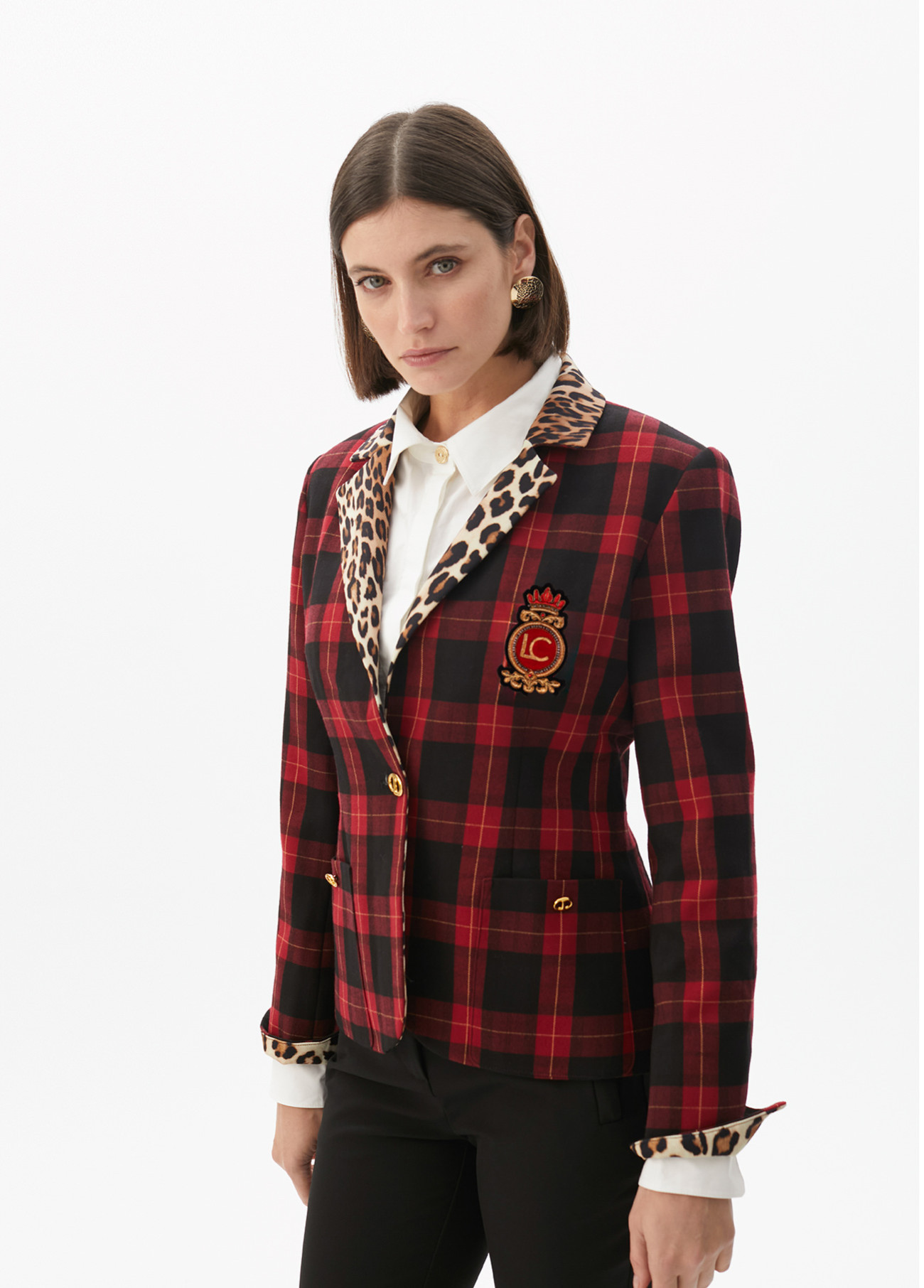 - Εφαρμοστό καρό σακάκι με λεπτομέρειες animal print στα πέτα και στις μανσέτες.