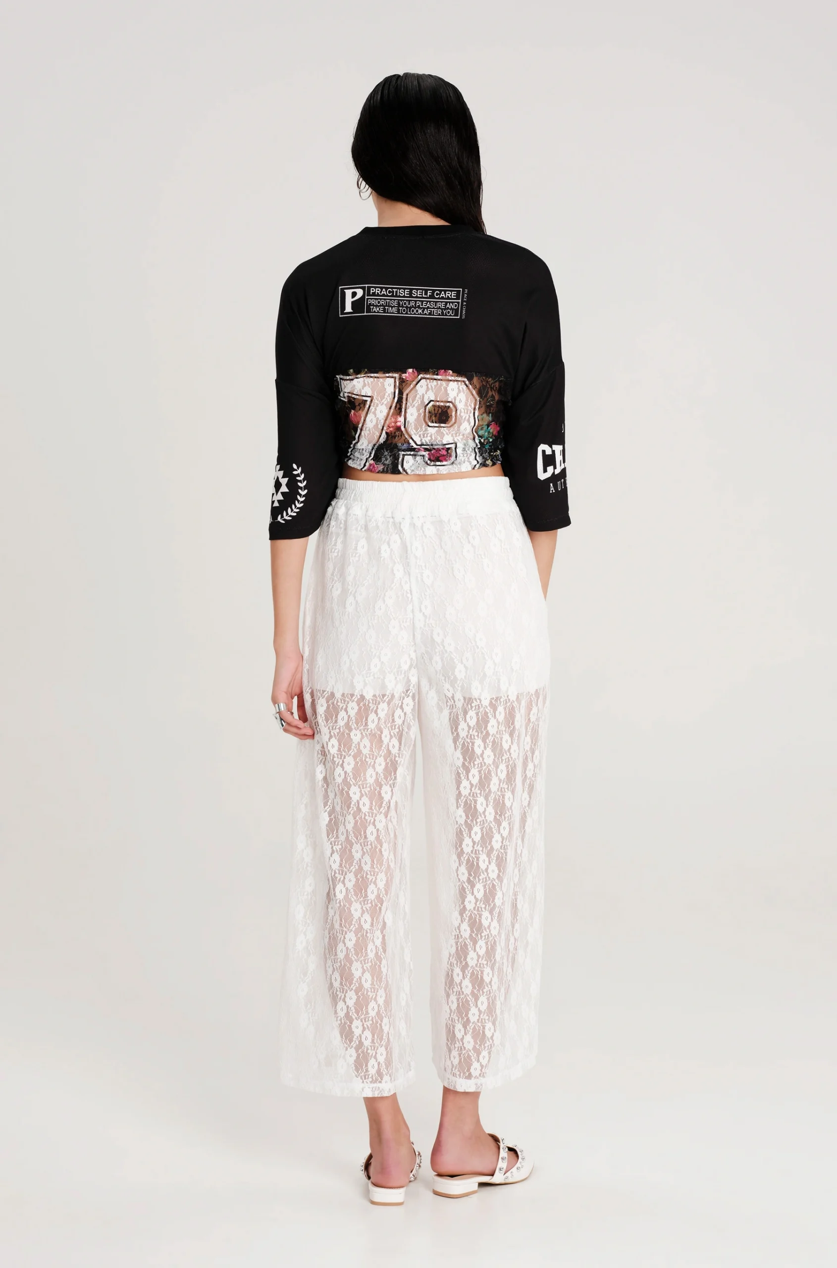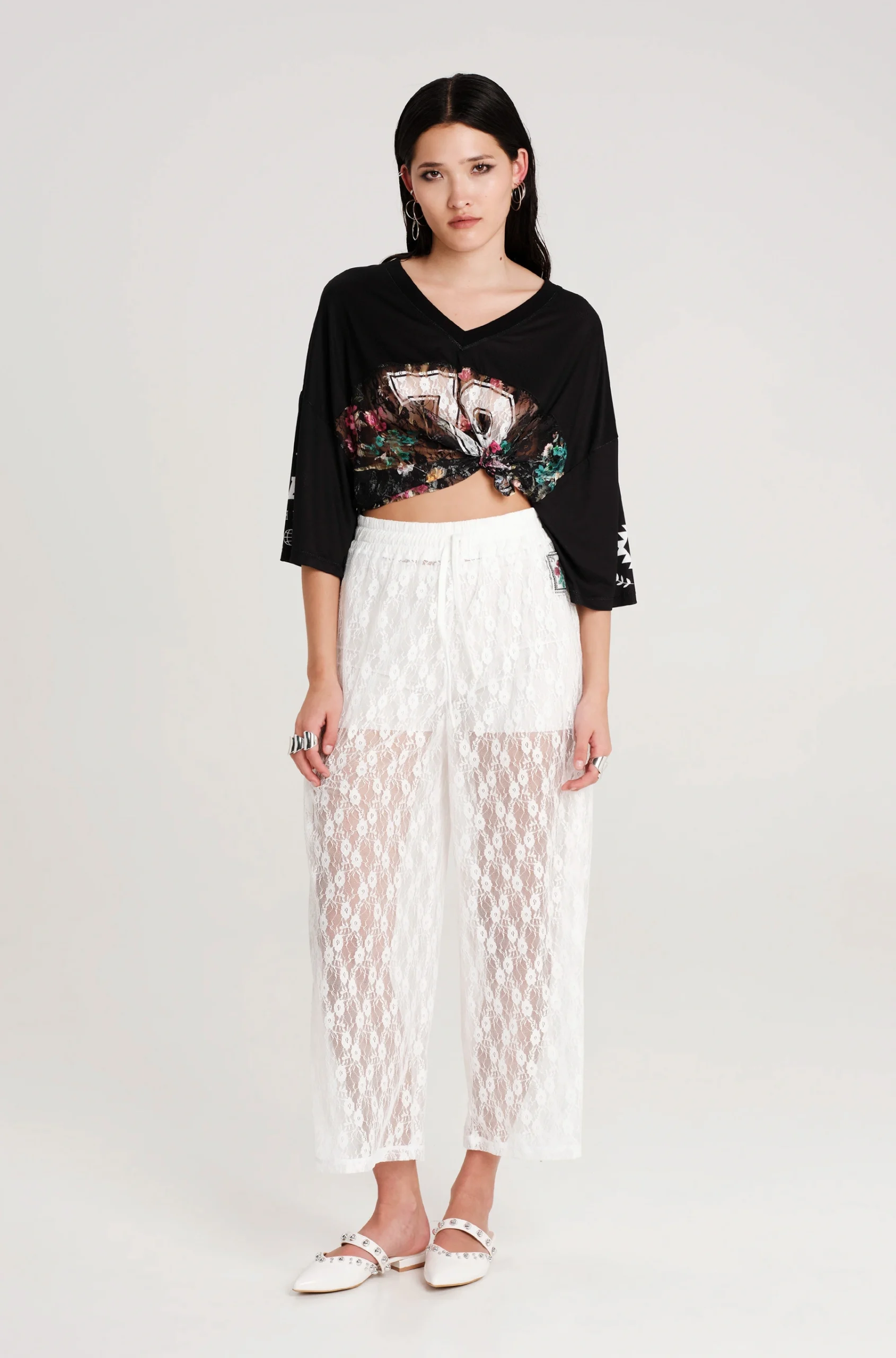 - Ψηλόμεσο παντελόνι από δαντέλα, με ελαστική- ρυθμιζόμενη μέση με σχοινάκι, φόδρα και κοντά φαρδιά μπατζάκια.