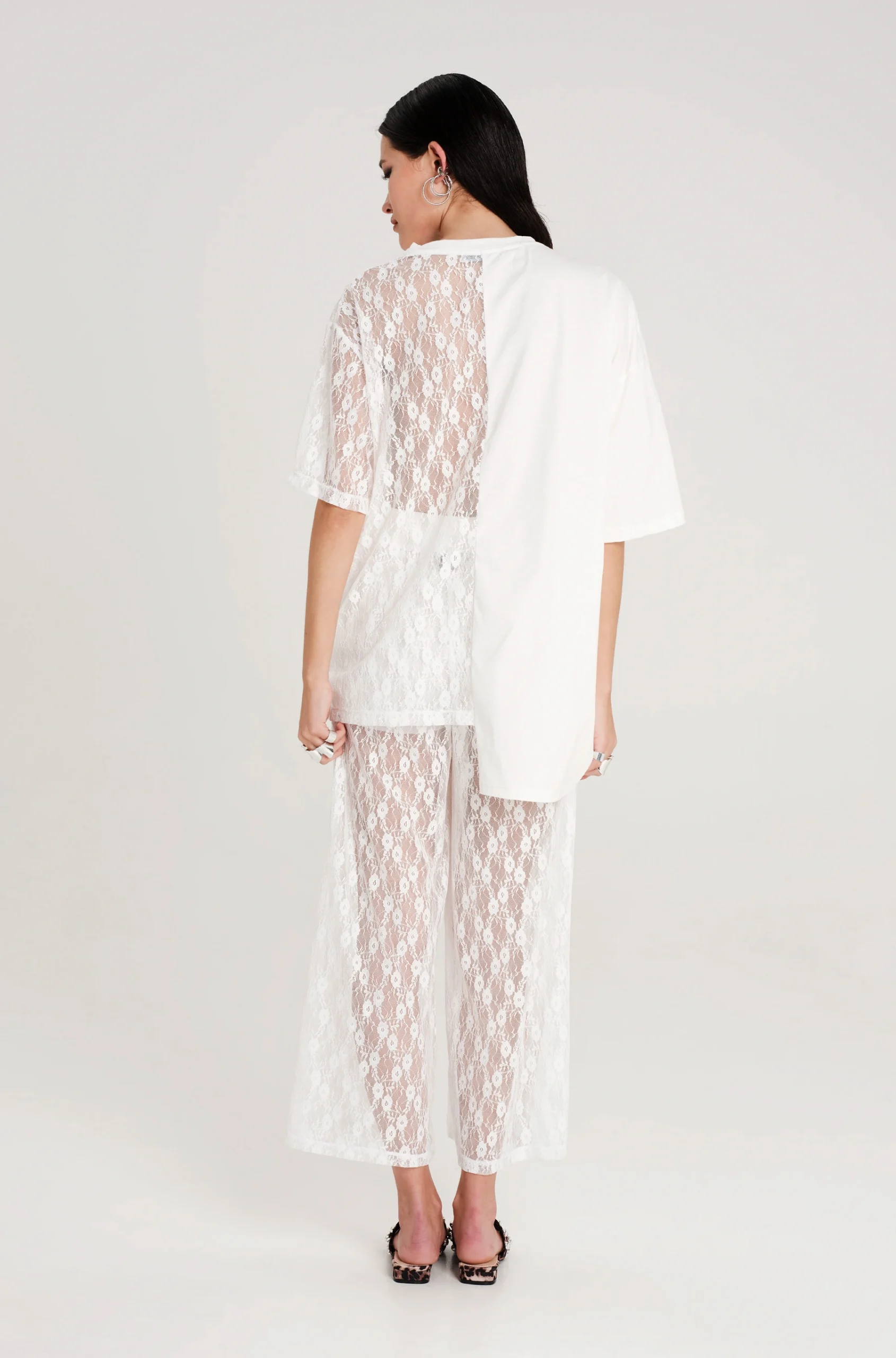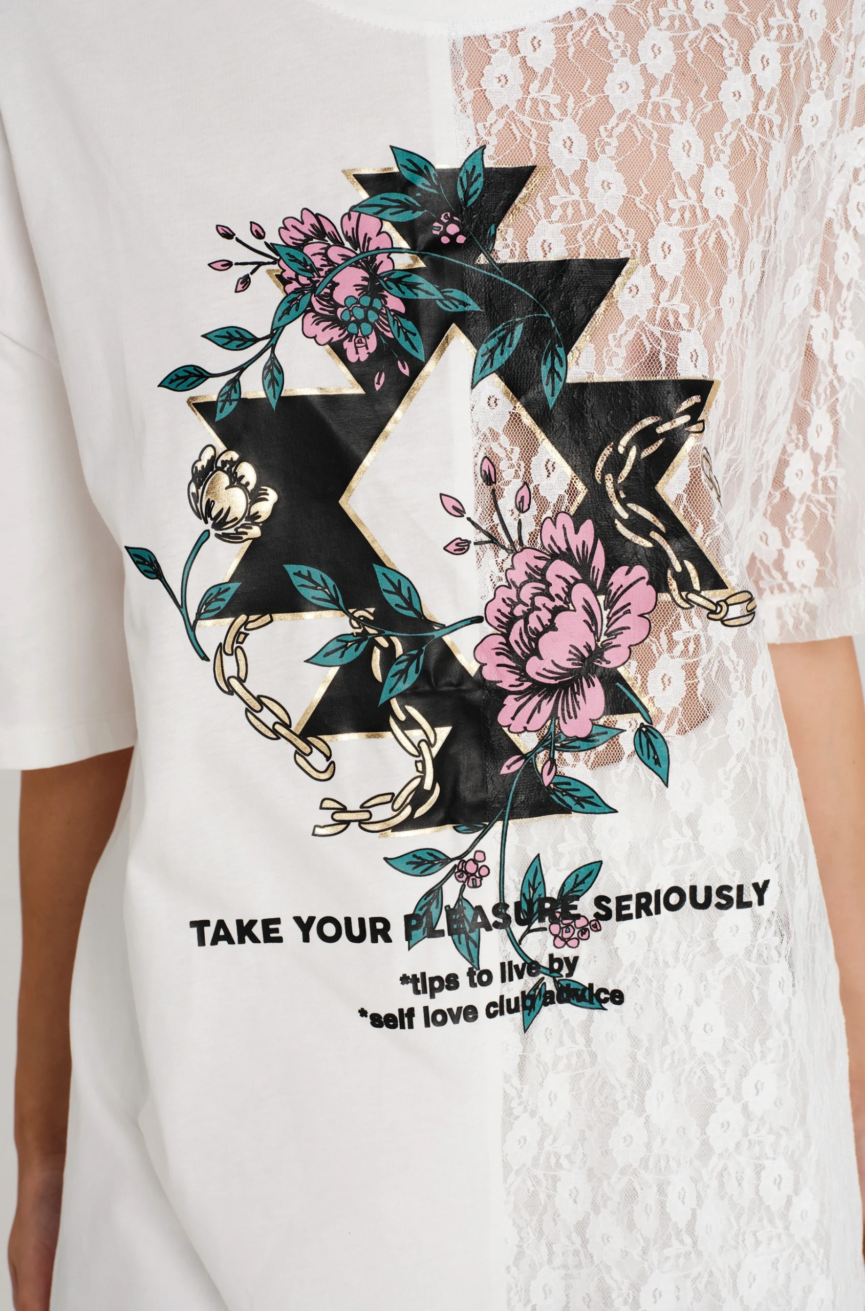 - Ασύμμετρο t-shirtμε συνδυασμό υφασμάτων από δαντέλα και βαμβάκι, στρογγυλή λαιμόκοψη και τυπωμένο λογότυπο μπροστά.