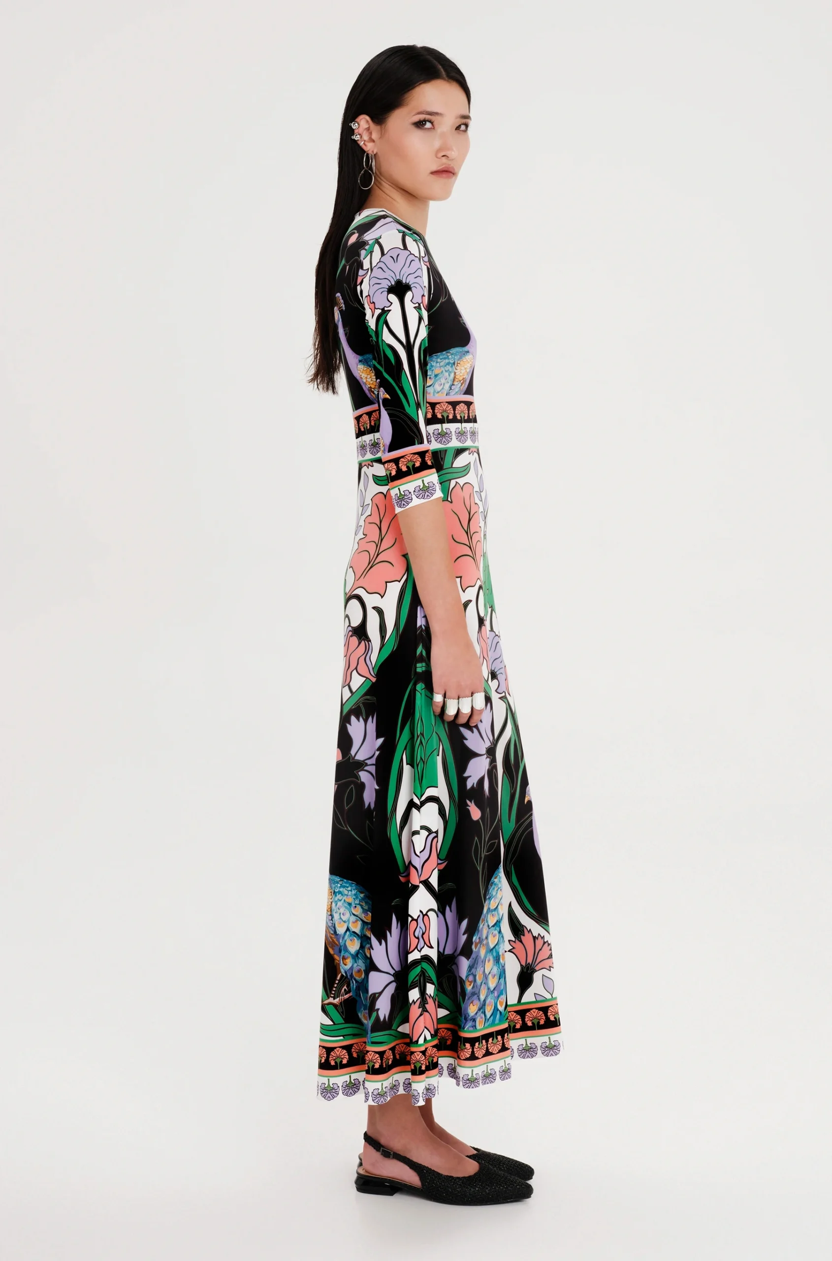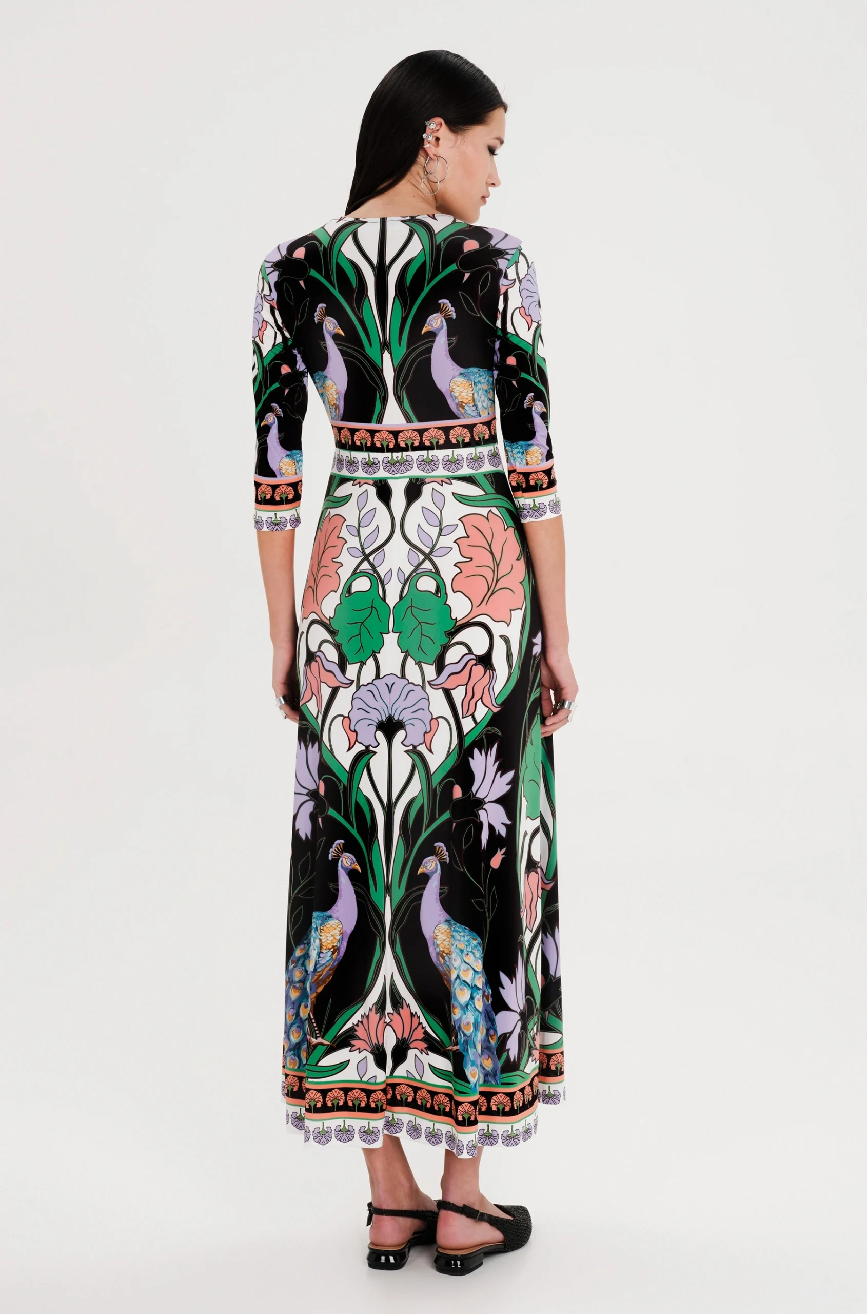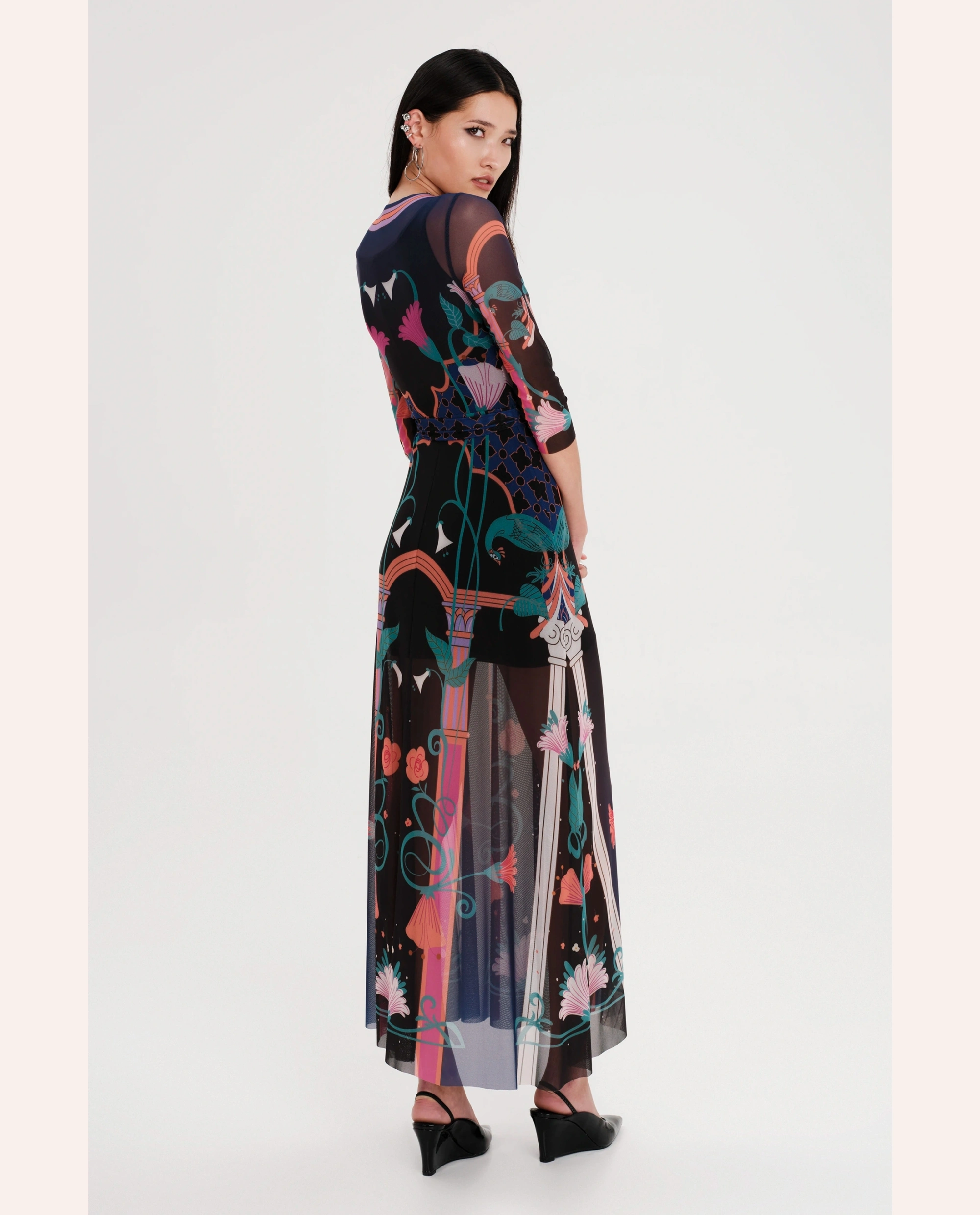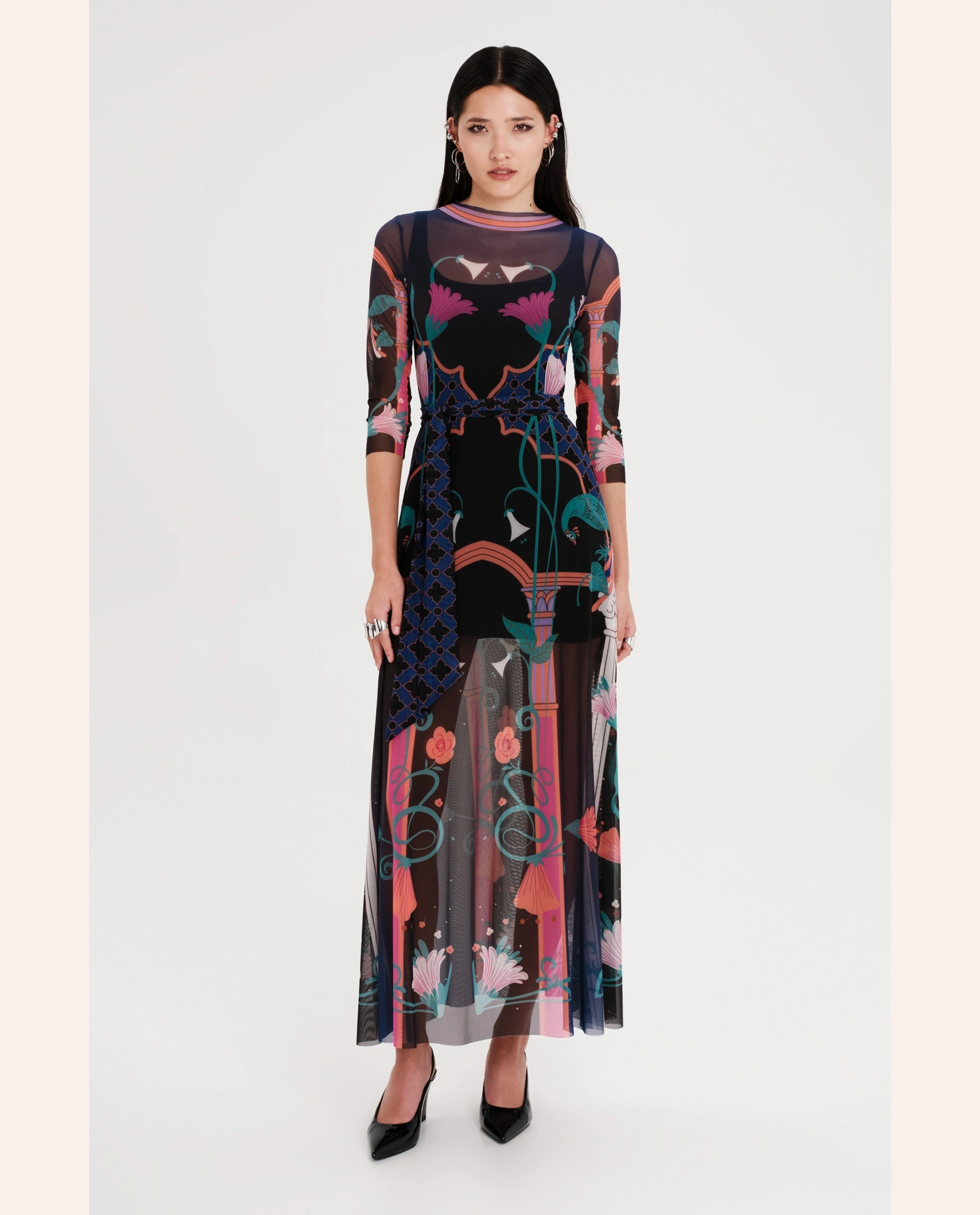 - Μακρύ φόρεμα από ελαστικό ύφασμα, με τύπωμα, στρογγυλή λαιμόκοψη και μανίκια ¾ .