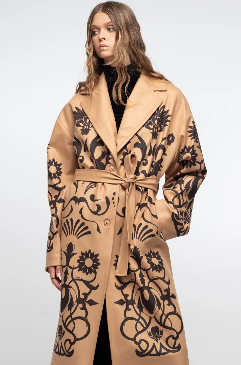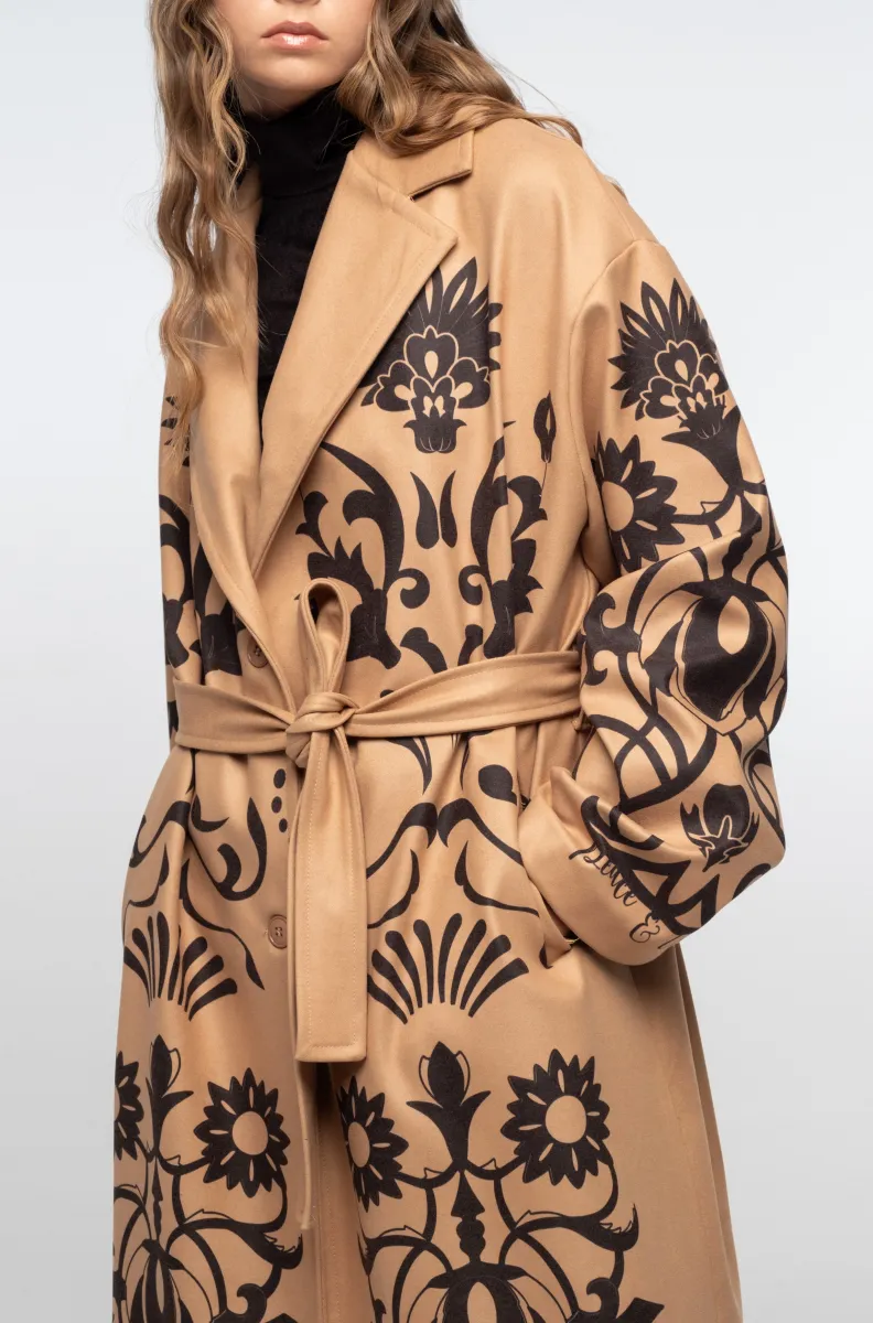 • Μίντι παλτό με τύπωμα, γιακά, βάτες στους ώμους, μακριά μανίκια καμπάνα, φόδρα και κλείσιμο με κουμπάκια μπροστά και αποσπώμενη ζώνη.