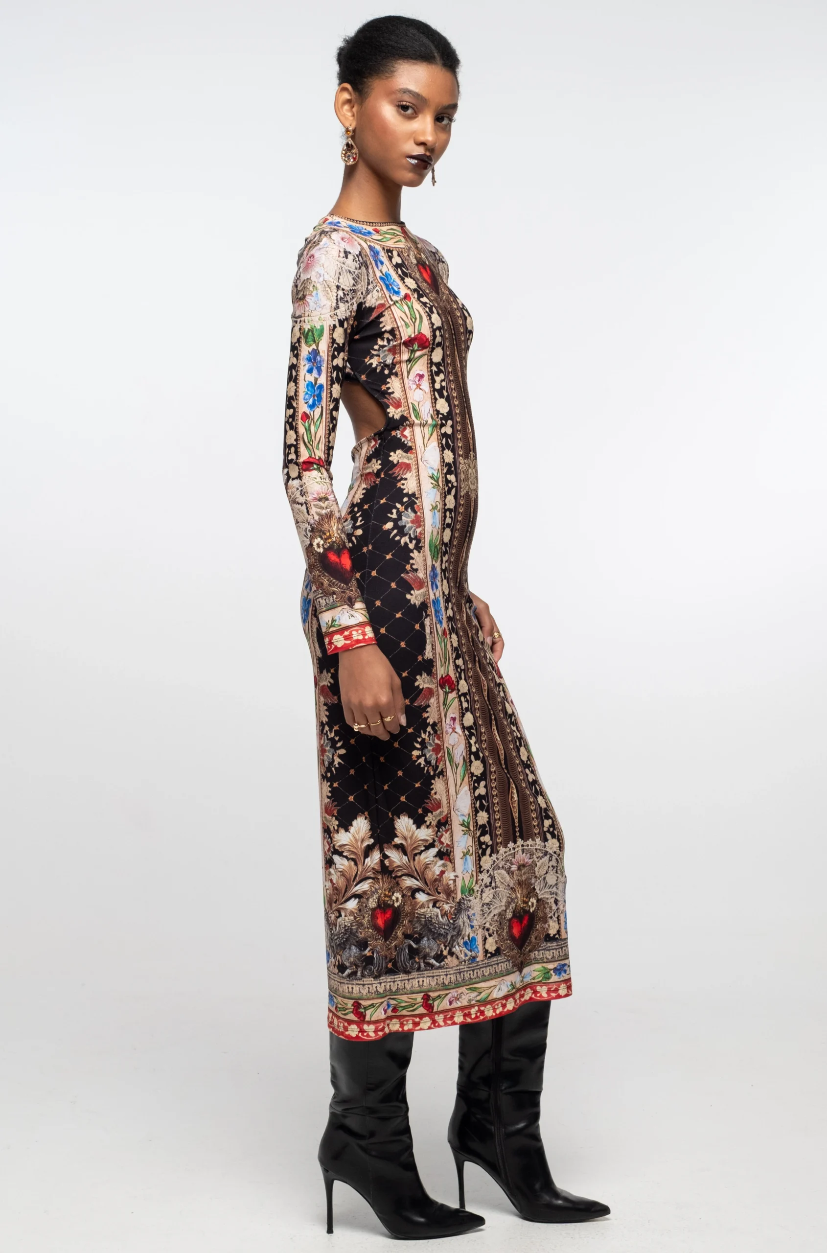 • Το πολυτελές φόρεμα μας συνδυάζει δαντέλα, μαργαριτάρια και λουλουδάτα μοτίβα σε τόνους κοσμημάτων με τον ισχυρό συμβολισμό των φλεγόμενων καρδιών μέσα στην μεγαλοπρεπή του εκτύπωση. Το λείο ζέρσεϊ δημιουργεί μια εφαρμοστή σιλουέτα, ενώ τα εφαρμοστά μανίκια επιμηκύνουν το μπράτσο. Η ανοιχτή πλάτη έχει μια λεπτομέρεια με μια πινελιά που προσθέτει στη συνολική διακόσμηση.