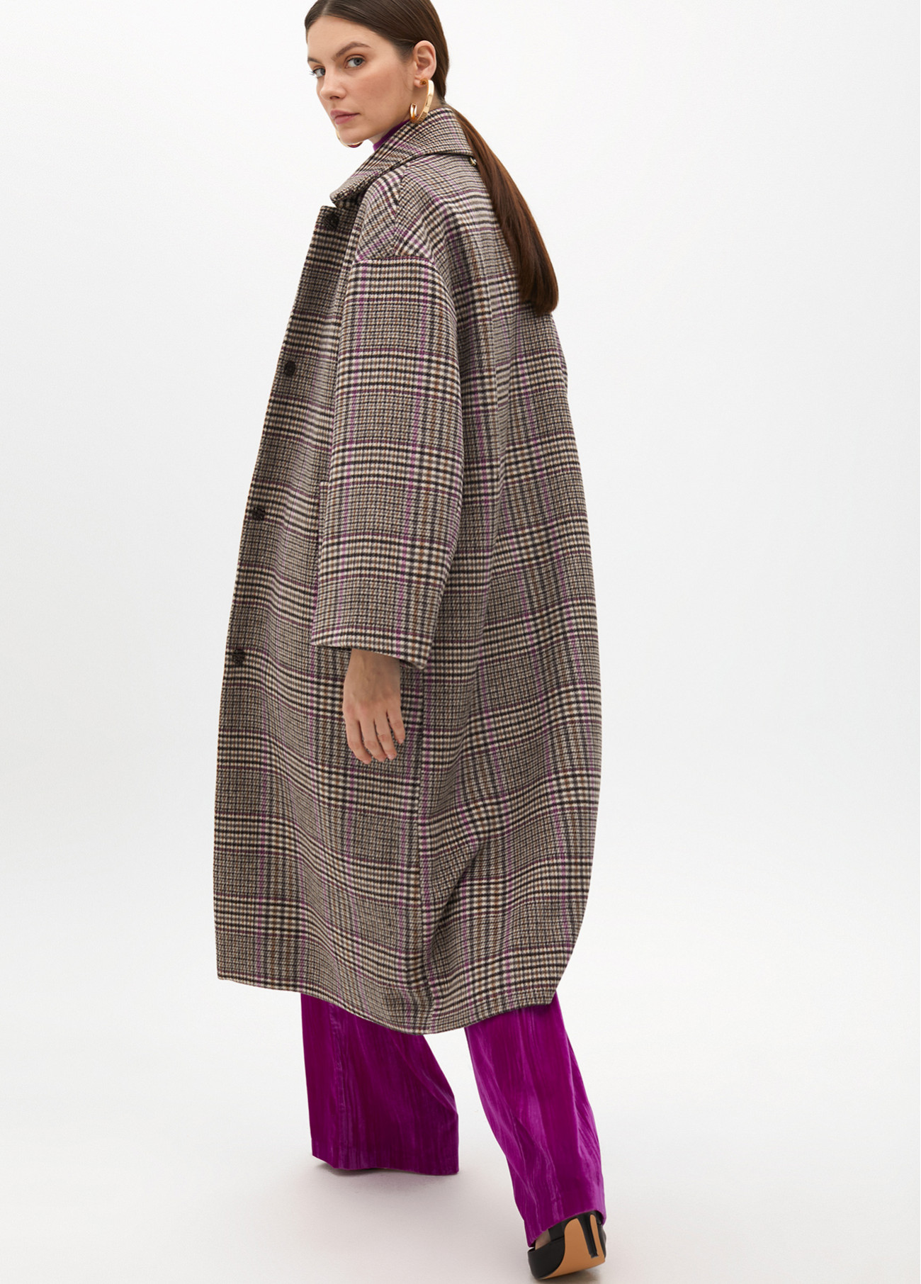 - Μάλλινο παλτό με καρό σχέδιο σε ουδέτερους τόνους.