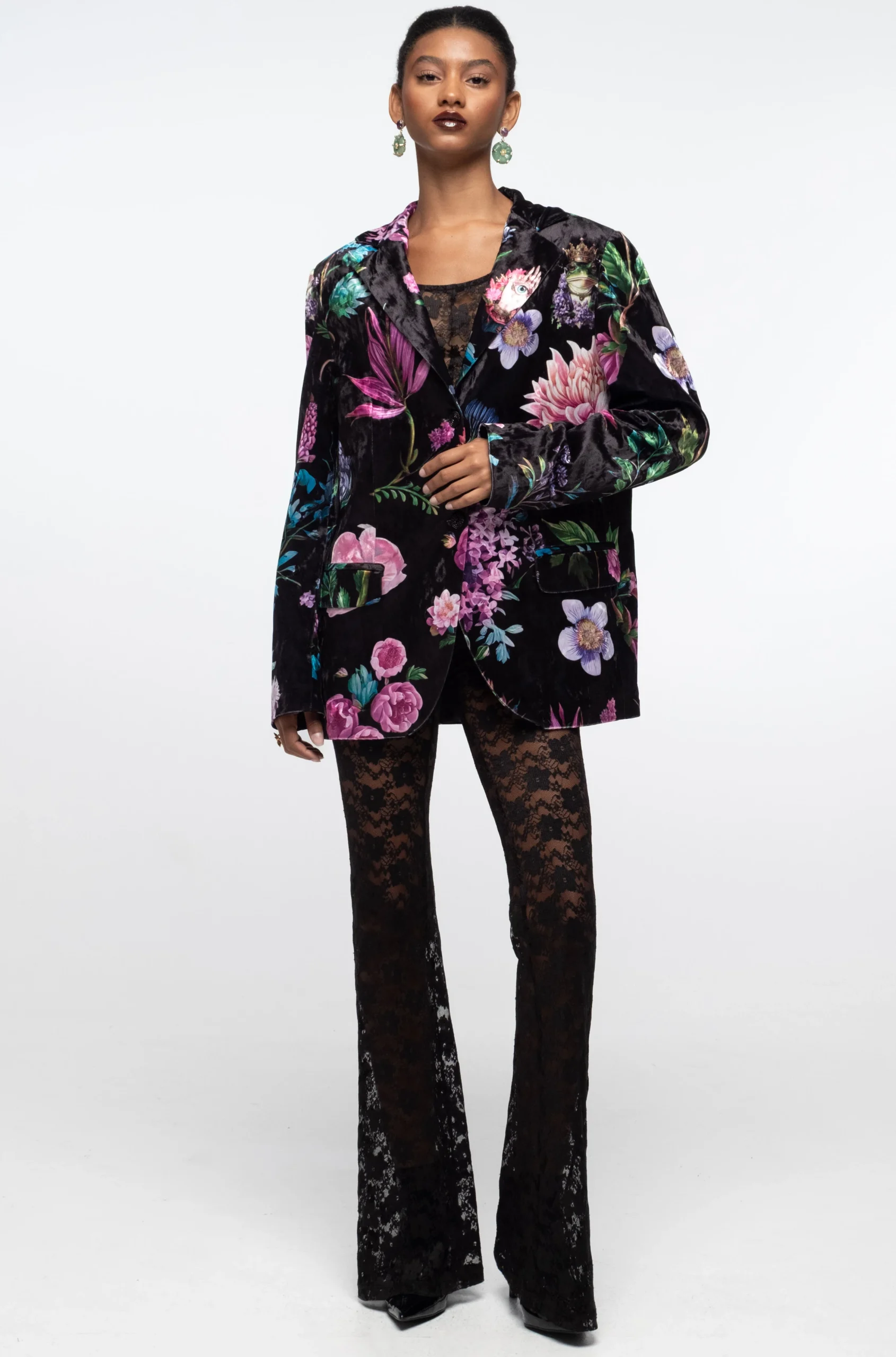 - Ψηλόμεσο παντελόνι από δαντέλα με λουλούδια, ελαστική μέση με τυπωμένο λογότυπο και καμπάνα μπατζάκια.
