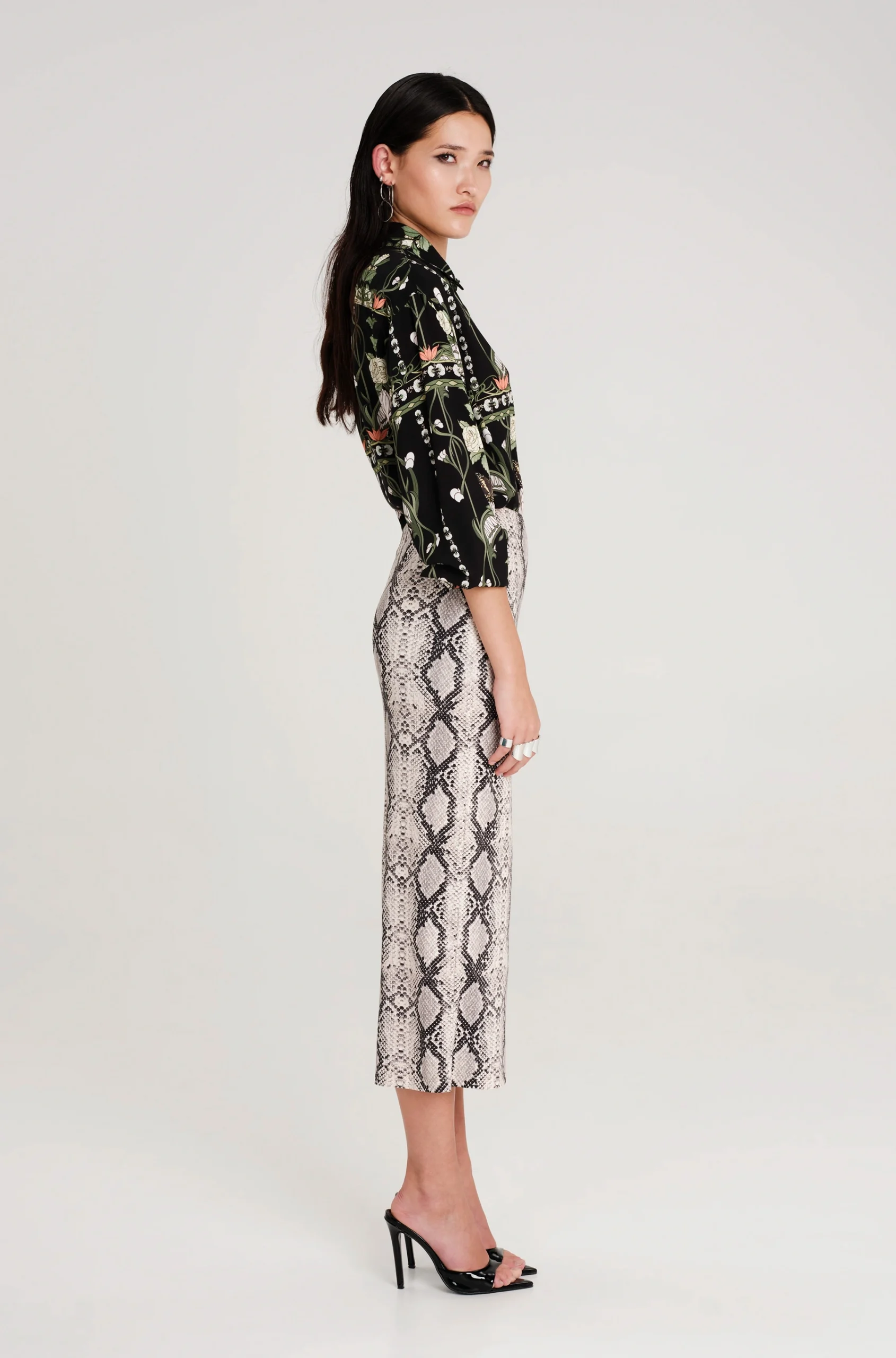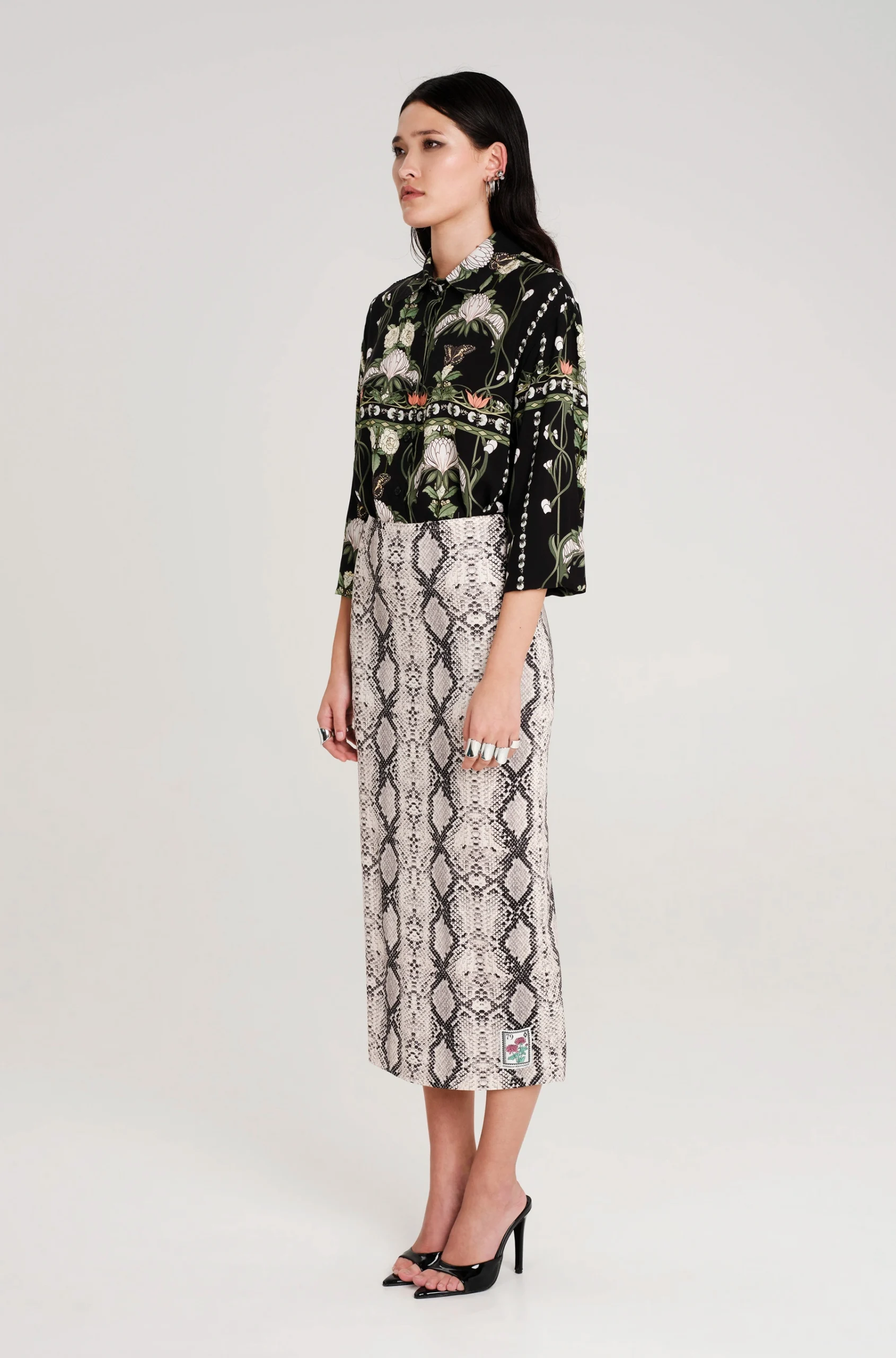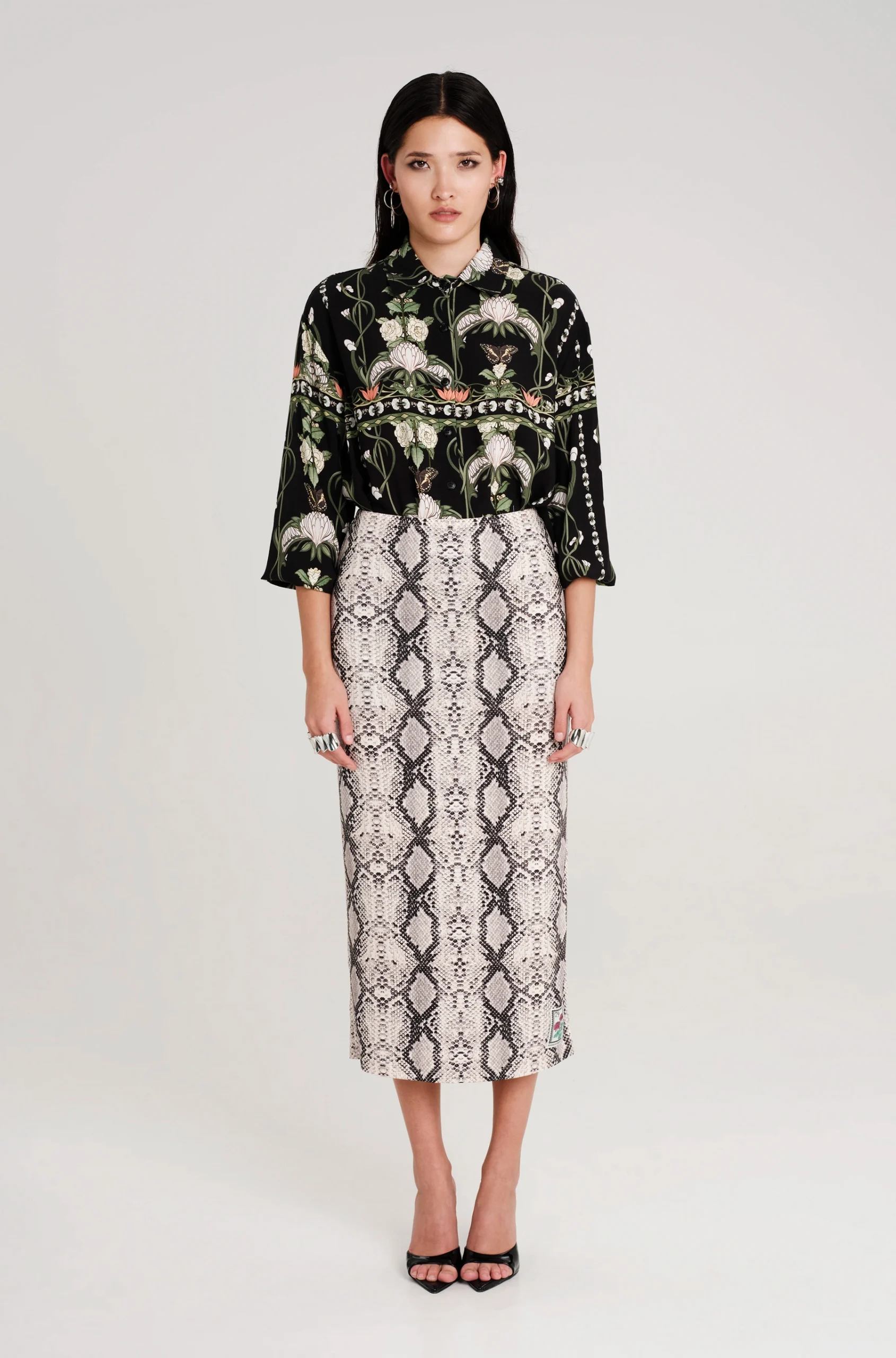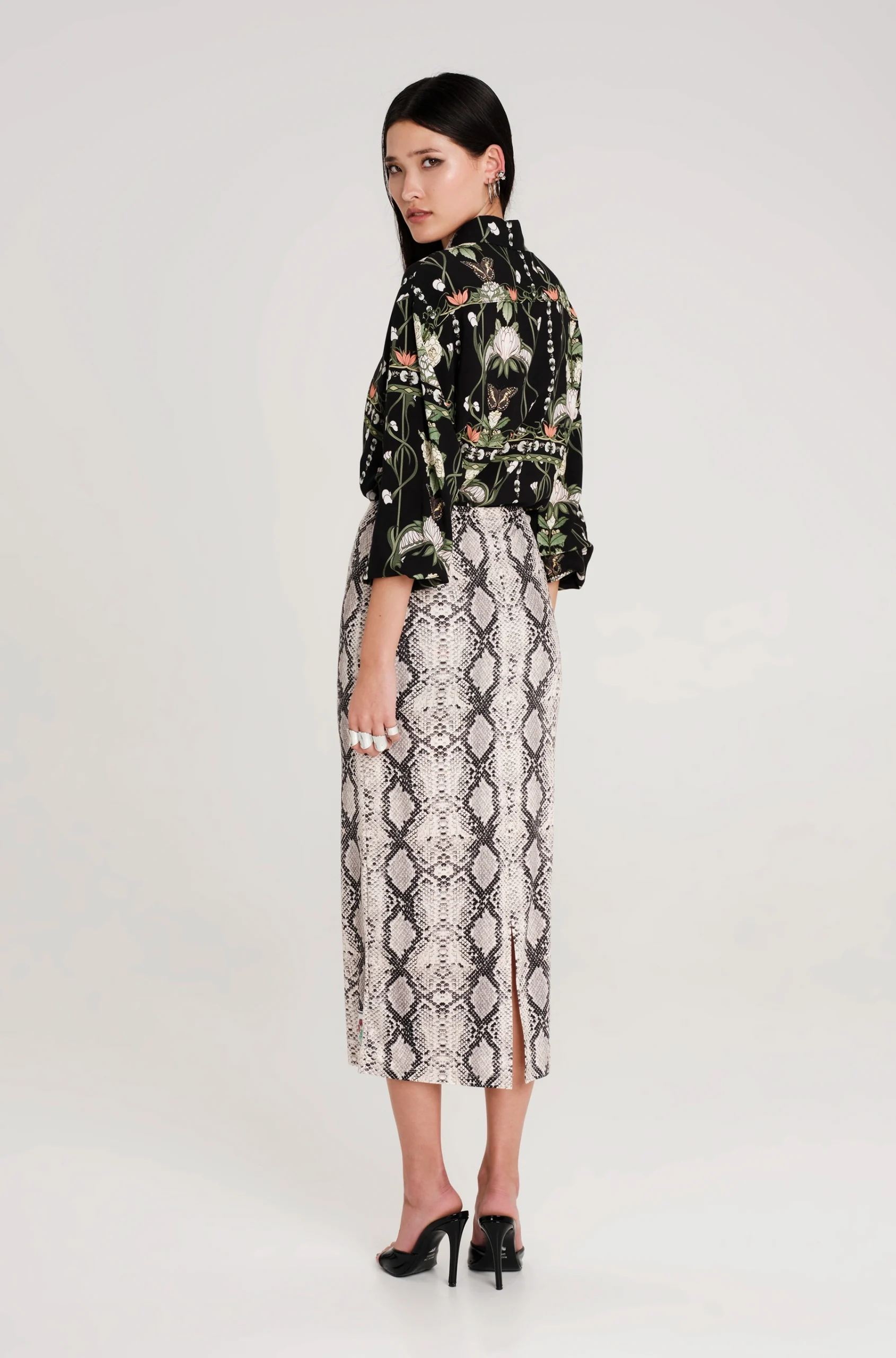 - Μίντι φούστα από ελαστικό ύφασμα με άνιμαλ τύπωμα και σκίσιμο στο πίσω μέρος.