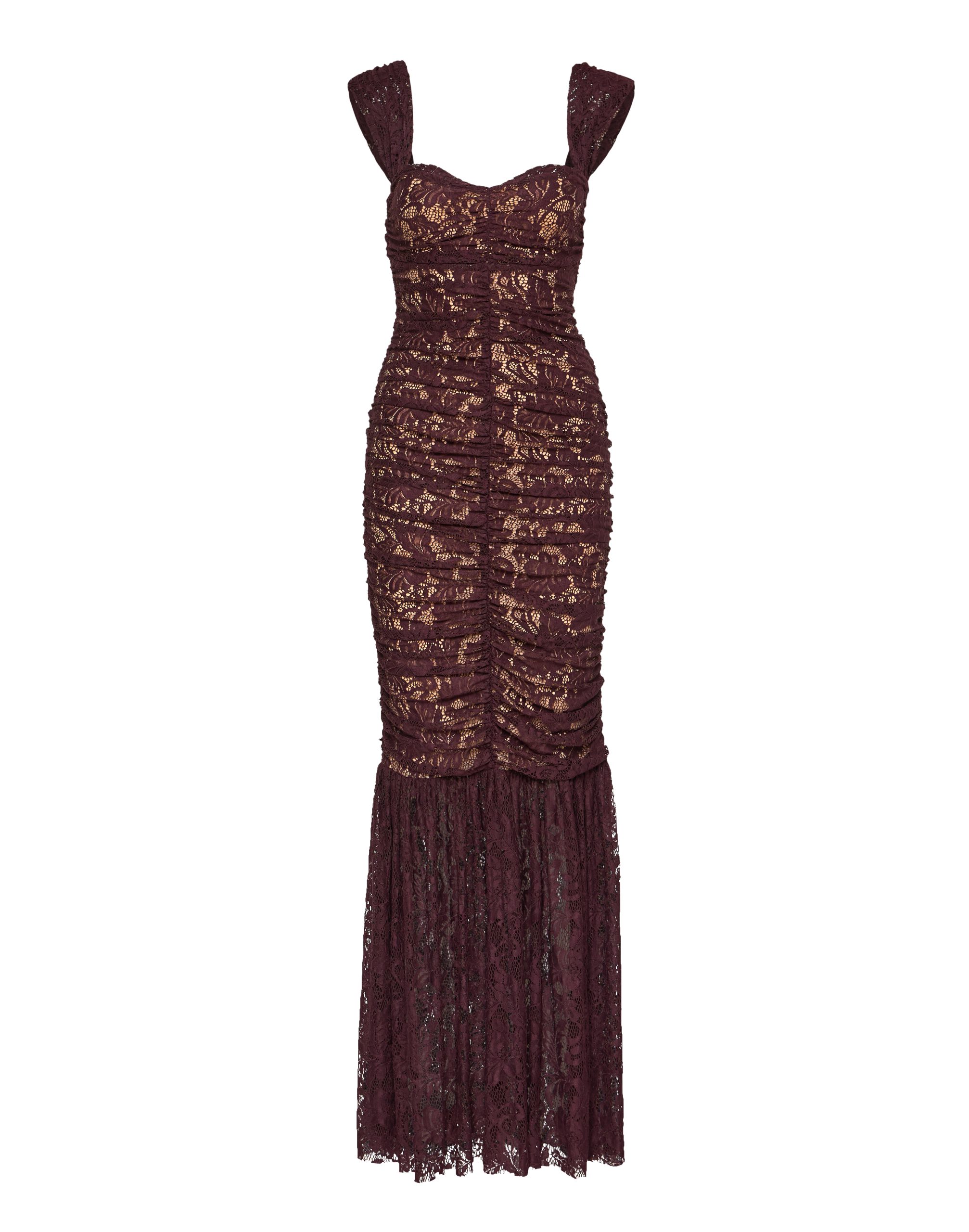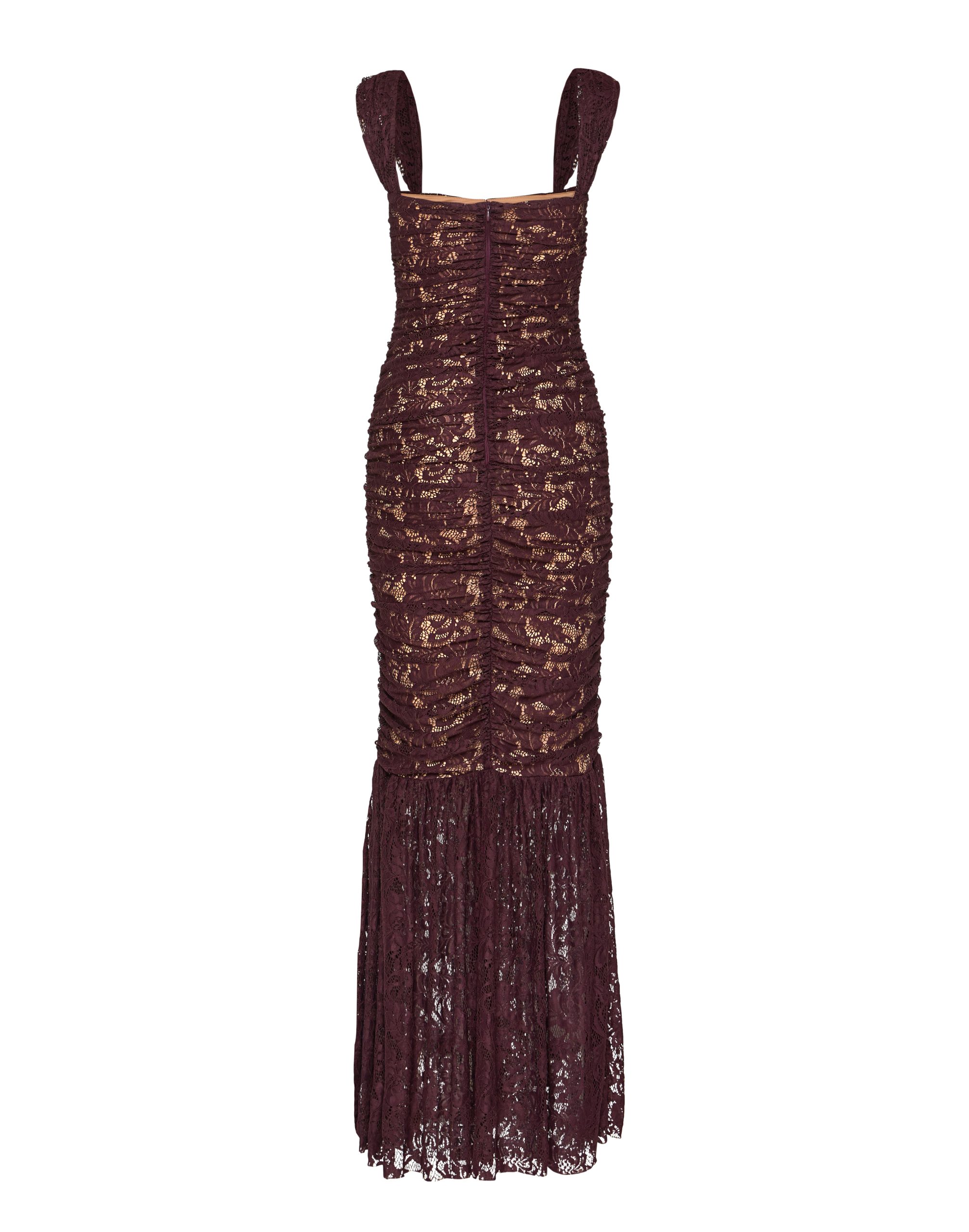 ο βαθύ μπορντό χρώμα αγκαλιάζει τη σιλουέτα με πολυτέλεια, ενώ η δαντέλα με τη χρυσαφένια της λάμψη αποκαλύπτει διακριτικά το σώμα μέσα από περίτεχνα μοτίβα. Το κορσέ-στυλ επάνω μέρος τονίζει θηλυκά το μπούστο, με φαρδιές δαντελένιες τιράντες που προσθέτουν μια vintage αισθησιακή πινελιά. Η εφαρμοστή γραμμή με το ανάγλυφο gathering σμιλεύει το σώμα, δημιουργώντας μια εντυπωσιακή hourglass εικόνα, ενώ το τελείωμα σε ανάλαφρη, διάφανη δαντέλα χαρίζει κίνηση και θεατρικότητα σε κάθε βήμα. Είναι ένα κομμάτι που αποπνέει σοφιστικέ ρομαντισμό και διαχρονική κομψότητα — ιδανικό για εμφανίσεις όπου η παρουσία σου θέλει να μιλήσει από μόνη της.