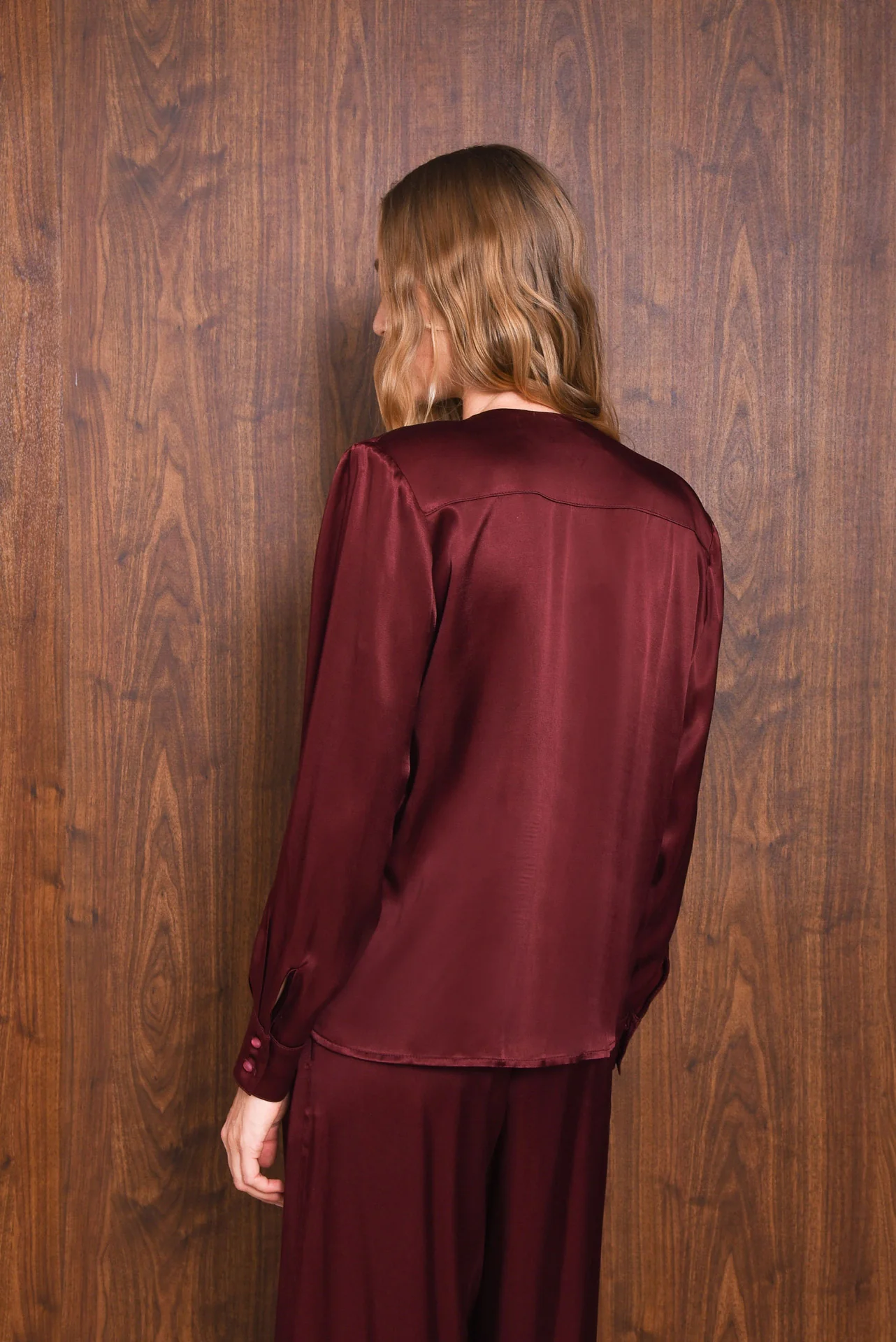 • Το  Vanity Shirt είναι μια απαλή, μεταξωτή μπλούζα με εφέ τύλιξης μπροστά και βαθύ ντεκολτέ σε σχήμα V. Διαθέτει μακριά μανίκια με ραμμένες μανσέτες, διακριτικά σουτιέν στους ώμους και καθαρό κλείσιμο. Το ρευστό ύφασμά του εφαρμόζει όμορφα, προσφέροντας κομψή, αβίαστη εφαρμογή—ιδανικό για συνδυασμό με φαρδιά παντελόνια ή για βραδινές εμφανίσεις.