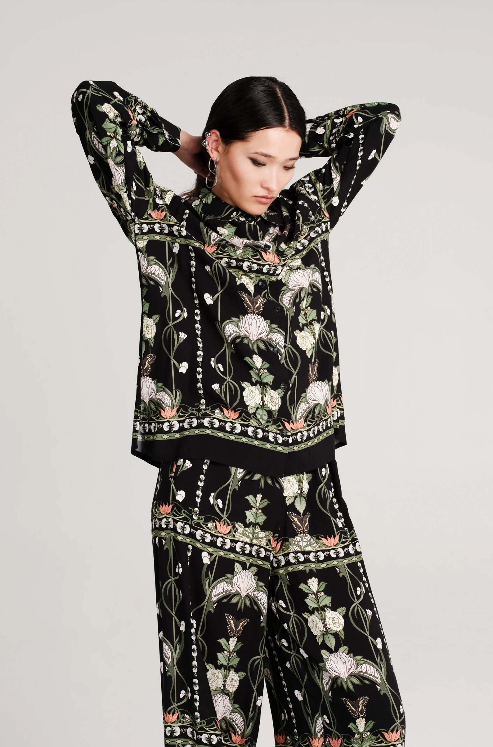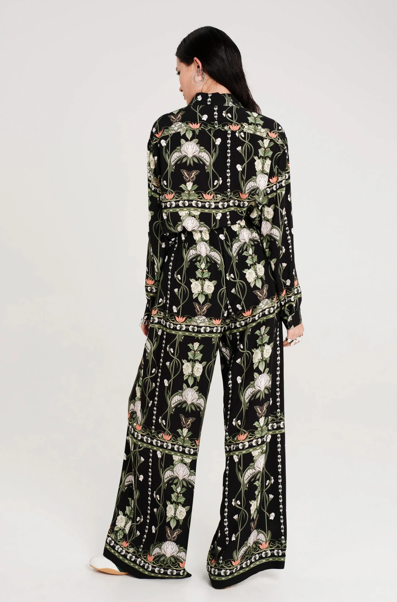 - Ψηλόμεσο παντελόνι με τύπωμα, ελαστική μέση, πλαϊνές τσέπες και φαρδιά μακριά μπατζάκια .